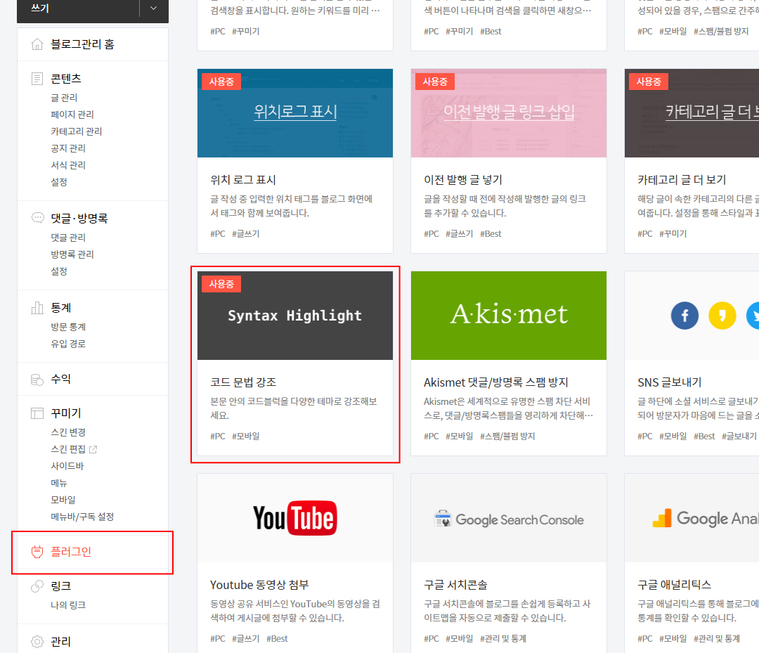 01. 블로그 설정에서 '플러그인 - 코드 문법 강조' 선택