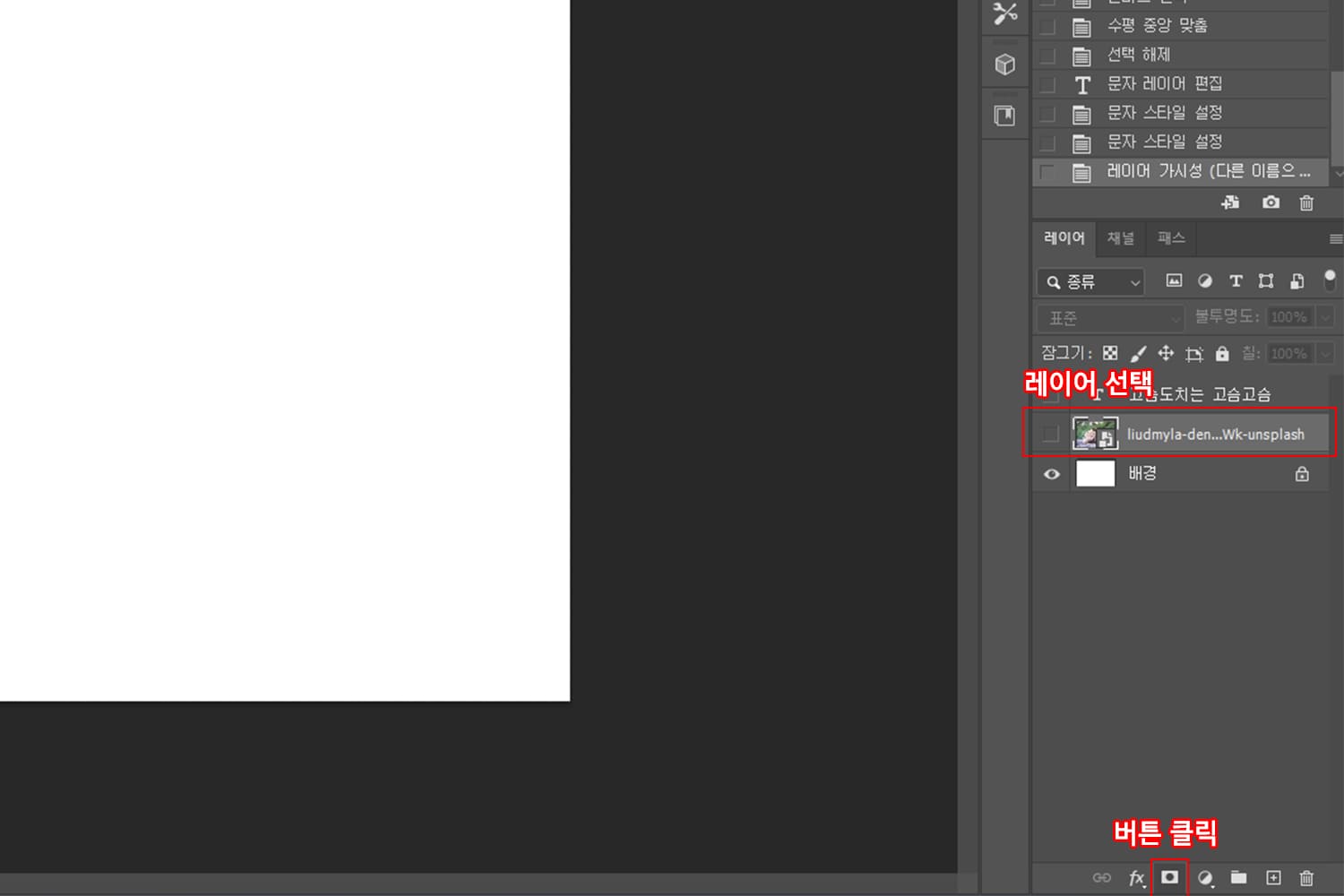 레이어마스크는 레이어를 선택한 후 레이어마스크 버튼을 누르면 레이어마스크가 생기게 됩니다.
