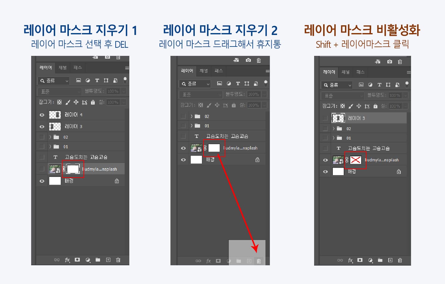 지우는 방법은 레이어 "마스크 선택 후 Delete키" or "레이어마스크 드래그해서 휴지통 아이콘에 넣기"