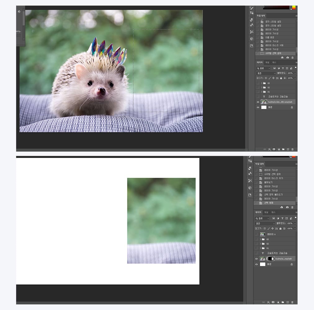 기능을 알아보기 위해 아래처럼 영역을 선택한 후 레이어마스크 버튼을 누르면 선택 영역만 살리고 나머지는 지워지게 됩니다.