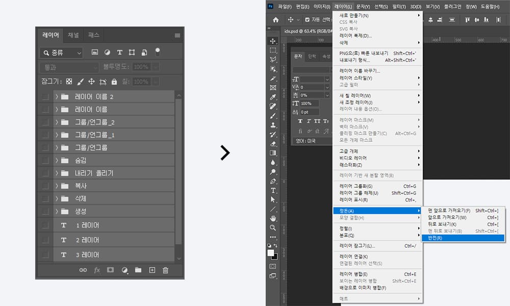 순서를 바꾸려는 레이어들을 모두 선택하고 "레이어 - 정돈 - 반전"을 클릭!