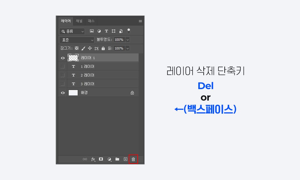 레이어를 선택하고 우측 하단에 휴지통 버튼을 누르거나 단축키[Del, ←(백스페이스)]를 눌러주세요.