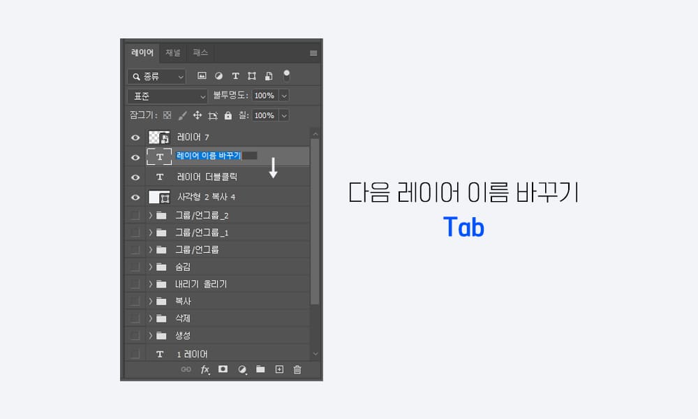 바로 그 밑의 레이어도 바꾸고 싶다면 Tab을 누르면 그다음 레이어의 이름이 자동 선택돼요.