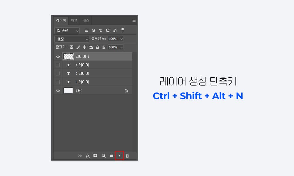 레이어패널에서 우측하단에 새 레이어 생성 버튼을 누르거나 단축키[Ctrl + Shift + Alt + N]를 눌러주세요.